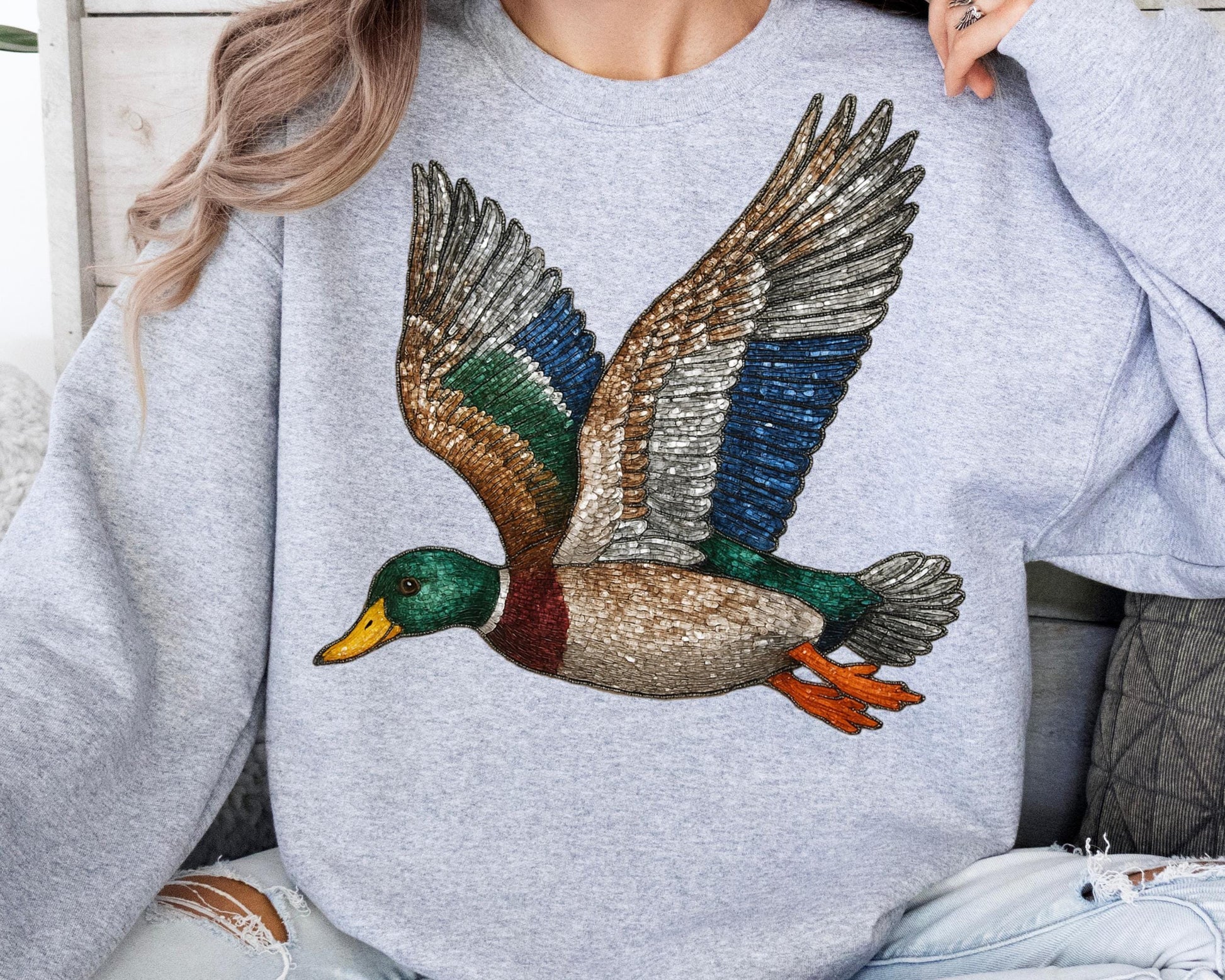 This cozy, ultra-soft sweatshirt features a beautiful faux rhinestone mallard duck design that sparkles and stands out. Perfect for country lovers, hunting season, farmhouse style outfits, or unique thoughtful gifts!